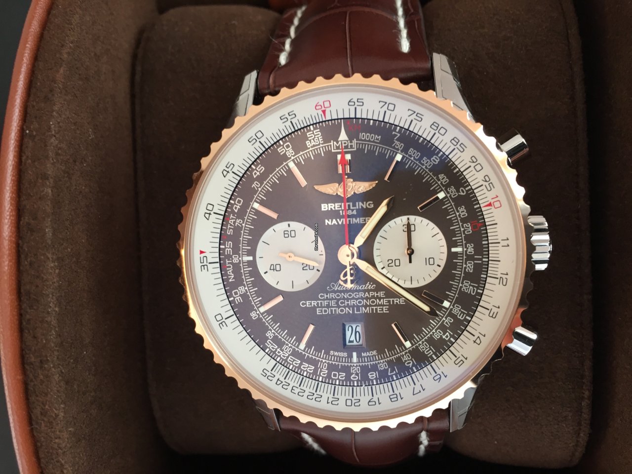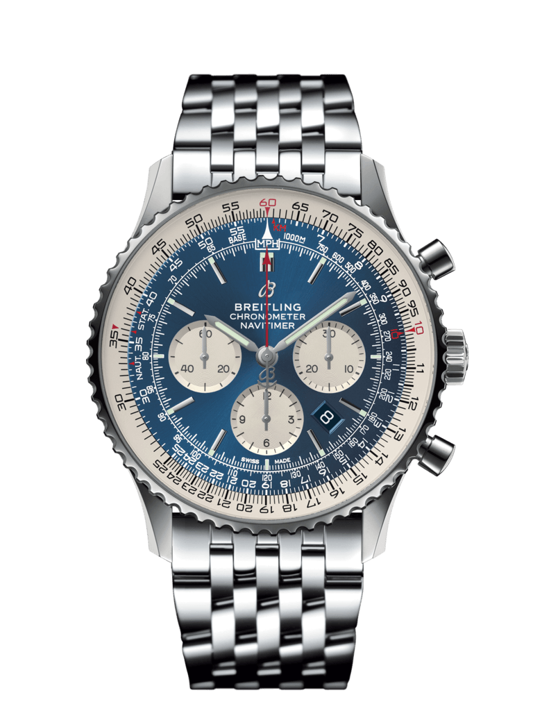 The classic Navitimer 1 features a generous 46 mm diameter accentuating its presence on the wrist and enhancing the originality of its design, while optimizing the readability of the dial and the circular aviation slide rule. A transparent caseback reveals the chronometer-certified, high-performance self-winding chronograph caliber, Manufacture Breitling Caliber 01. In addition to the steel and steel & gold versions, this model is available in red gold. A larger-than-life take on the legend.